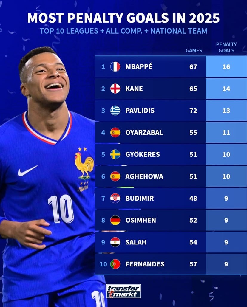 德转列2025年欧洲前10联赛球员点球得分榜:姆巴佩16球第1