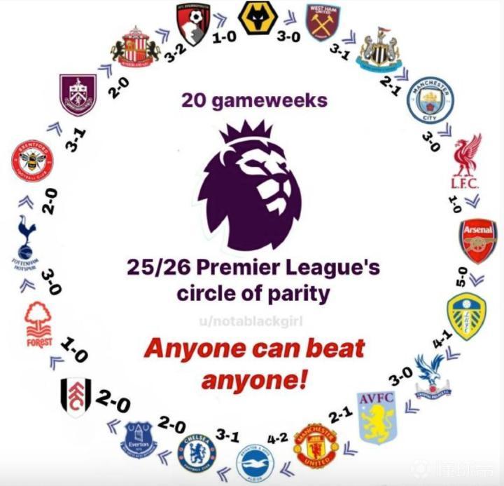 北京时间1月4日,英超第20轮焦点战在莫利纽克斯球场打响,狼队以3-0的绝对优势横扫西汉姆联,斩获本赛季英超首场胜利。这场胜利不仅改写了狼队的命运轨迹,更让整个英超联赛陷入前所未有的混沌格局——20支球队竟形成了一个"谁都可能战胜谁"的完美循环。